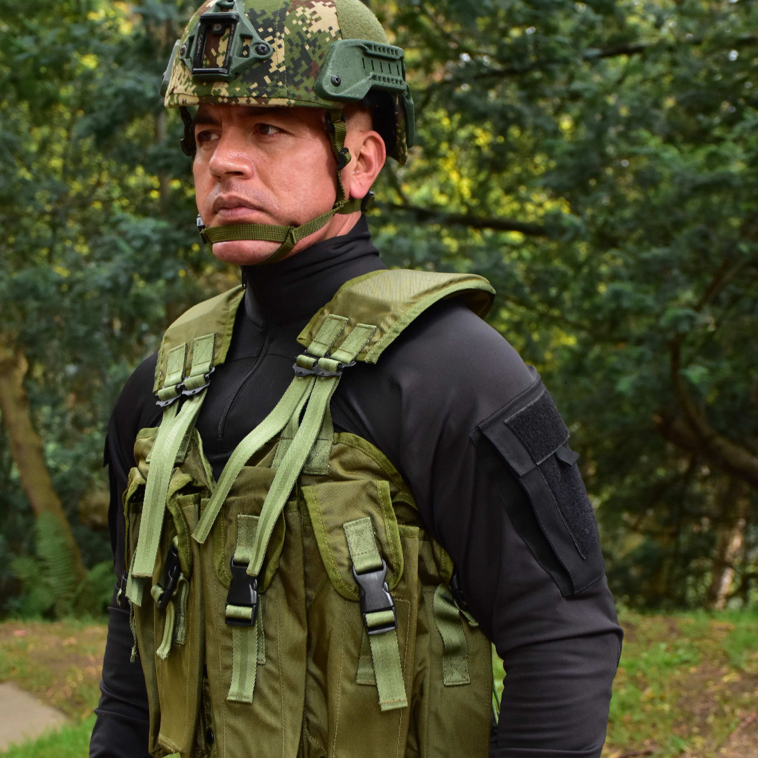Diseñado para fuerzas especiales, este chaleco tiene 10 bolsillos para cargadores de rifle de 5,56 mm, 2 para granadas de mano, uno para radio y otro para brújula. En la parte trasera incorpora una bolsa de asalto extraíble y un compartimento para primeros auxilios. - Fabricado en doble lona impermeable y resistente, con amarres y herrajes de alta calidad, es personalizable según las necesidades operativas.